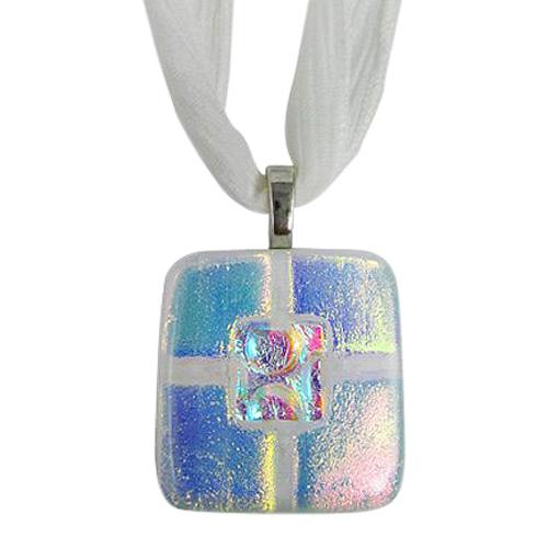 The Clear Blue Small Memorial Ashes Pendant (silver and blue color mix) is made from dichroic glass. The cremation pendant can be designed in two ways; one is with visible ashes (viewed from the back of the pendant) or with hidden ashes (fired into the glass). Please specify below only if you would like visible ashes, otherwise they will be hidden and fired into the glass.