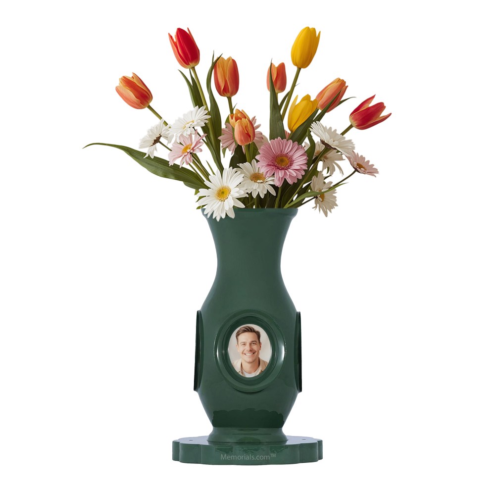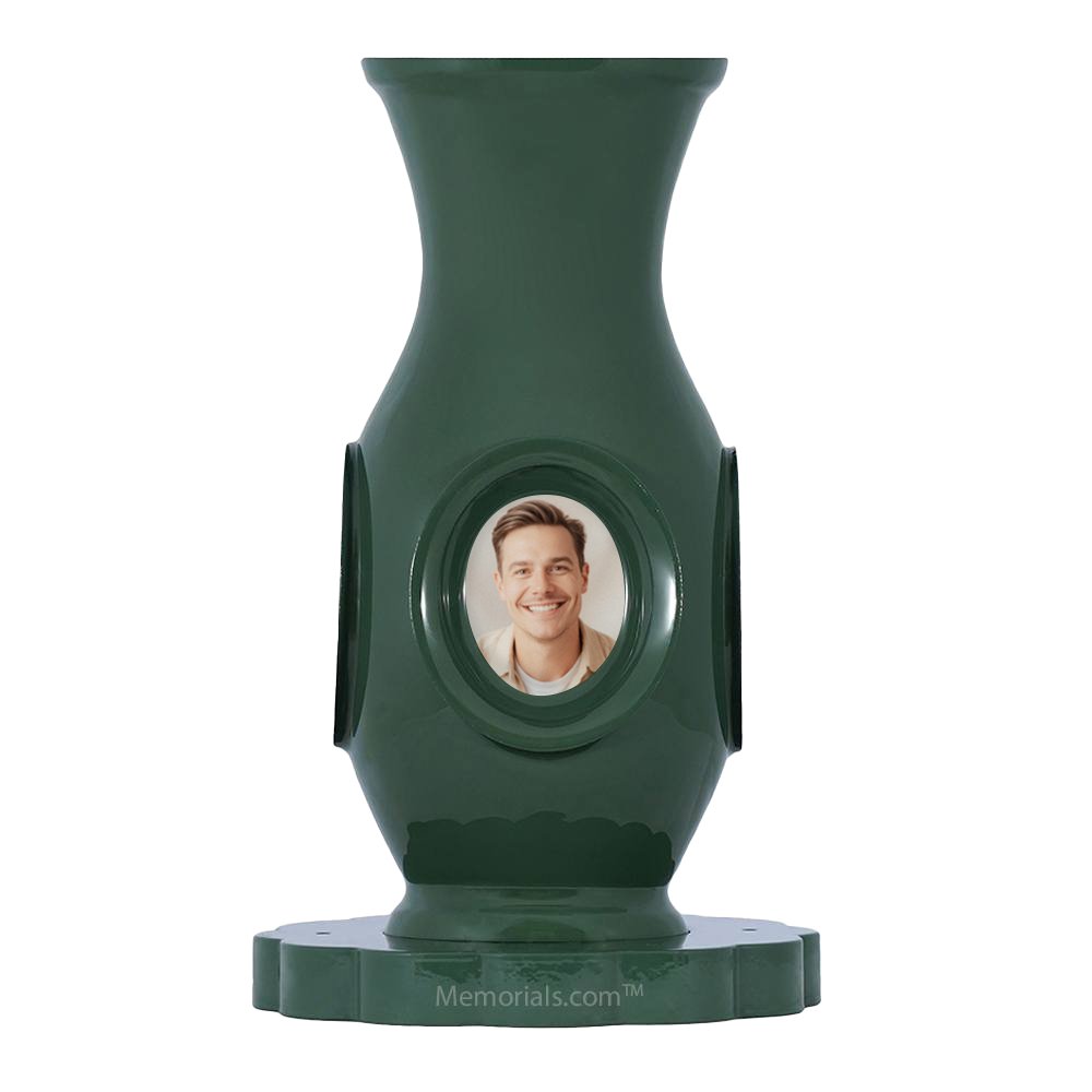 The Vase of Life Forrest Luxury Cremation Urn is a unique urn and vase. The Vessel is made of high quality aluminum, and can hold 4 photos that can be changed out at any time. The vase and urn combo sits upon an attached Lazy Susan turn table, perfect to display in your home.