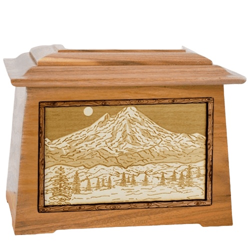 The Mt Baker Aristocrat Cremation Urn is made from oak wood and finely crafted pieces featuring a breathtaking, realistic nature scene, expertly carved into three dimensions using up to 7 kinds of wood. There is no paint on this urn. This will be a beautiful family heirloom for generations to come. It is master crafted in the United States by some of the most talented woodworkers in the nation.