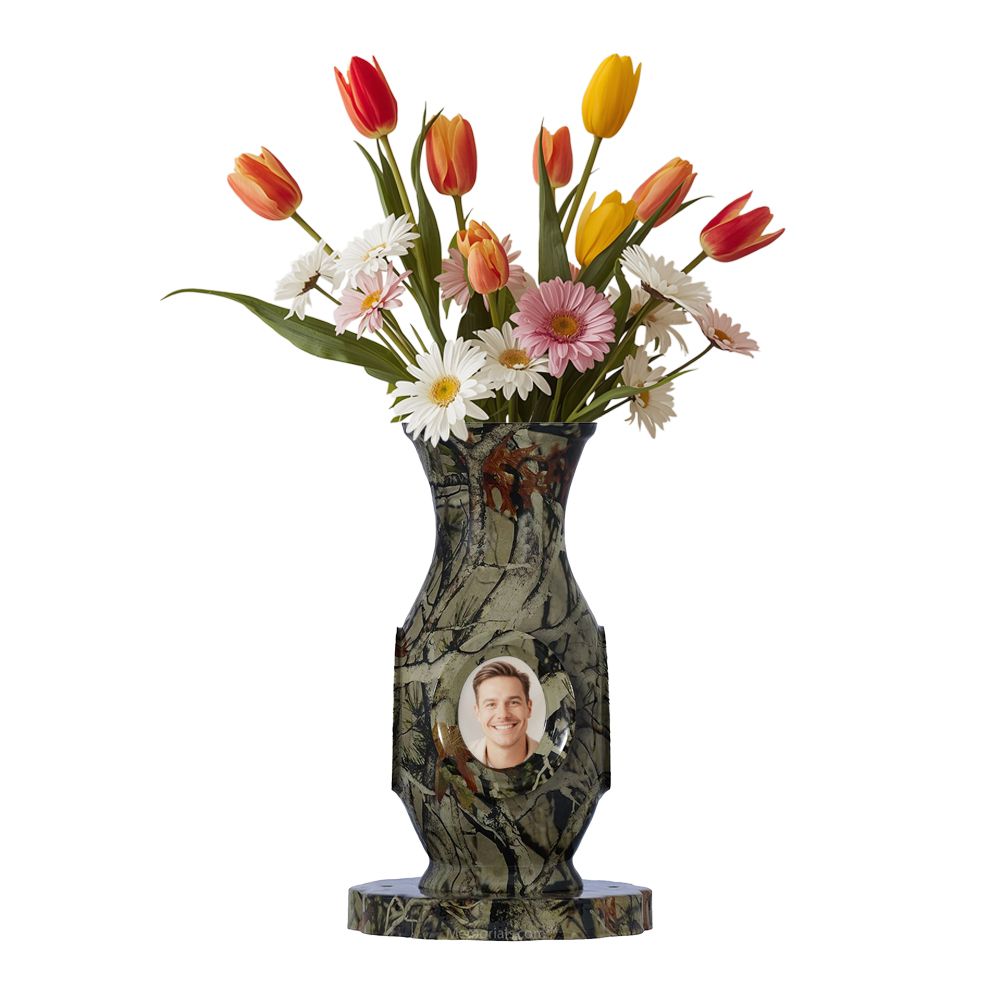 The Vase of Life Camo Luxury Cremation Urn is a unique urn and vase. The Vessel is made of high quality aluminum, and can hold 4 photos that can be changed out at any time. The vase and urn combo sits upon an attached Lazy Susan turn table, perfect to display in your home.