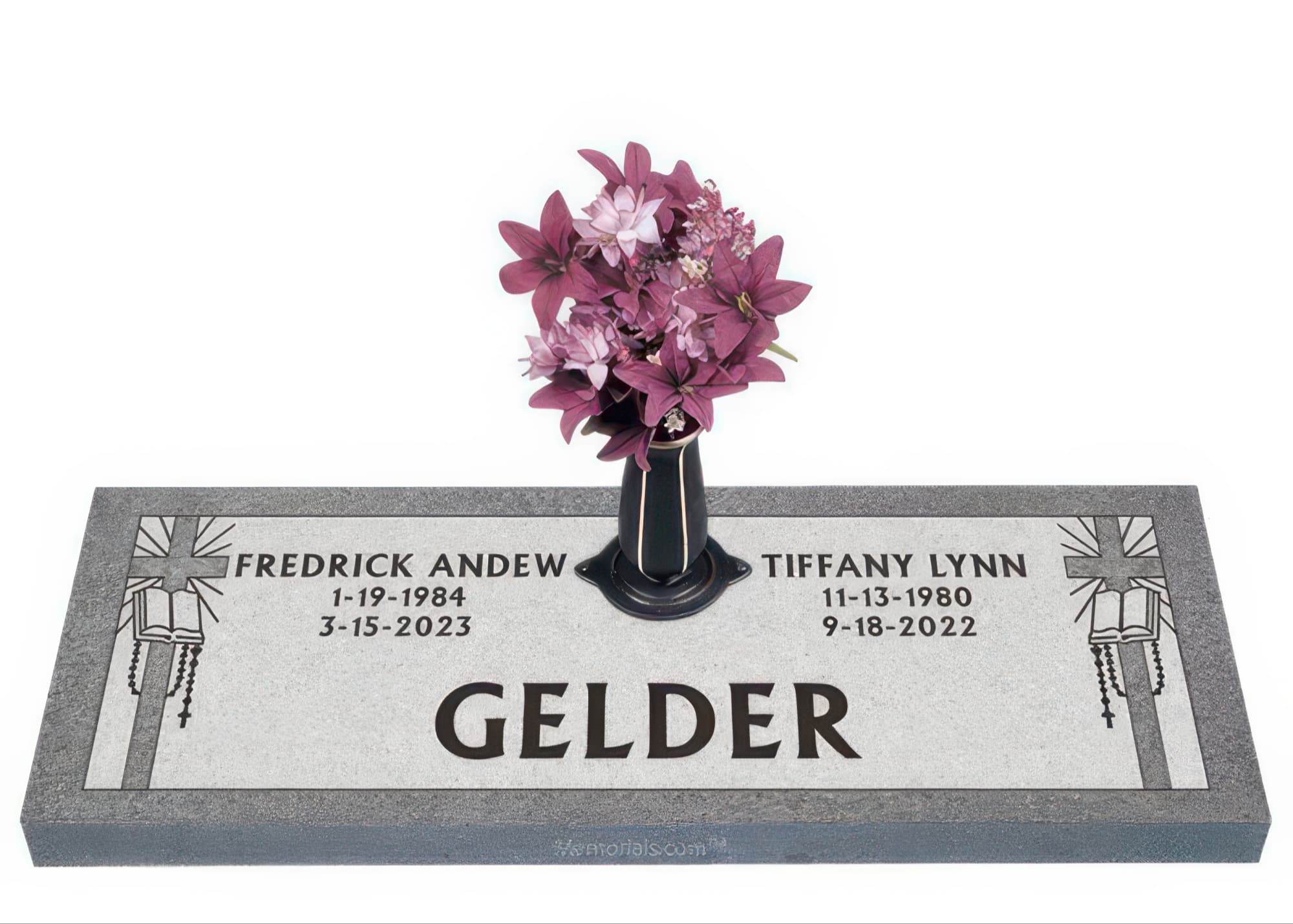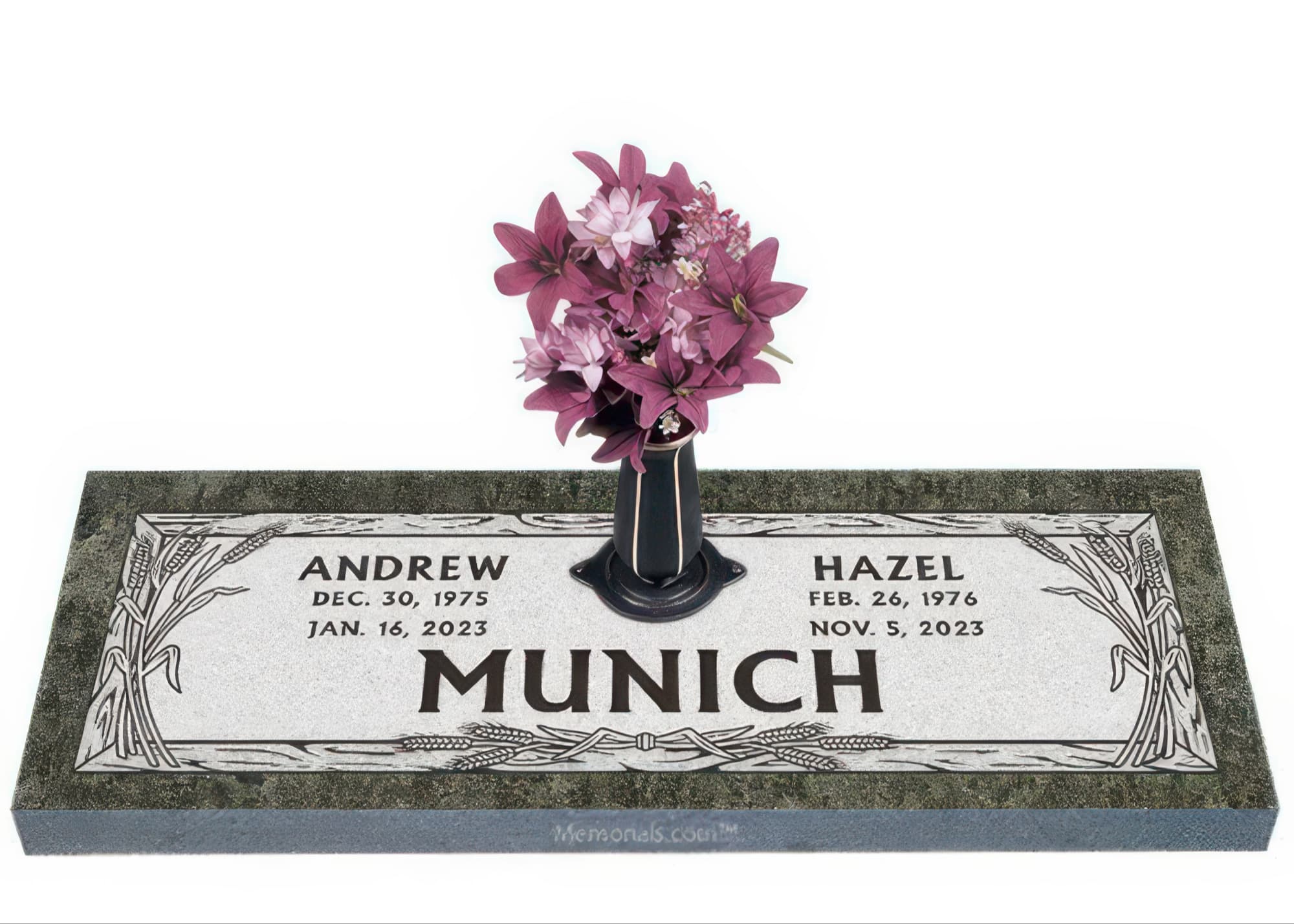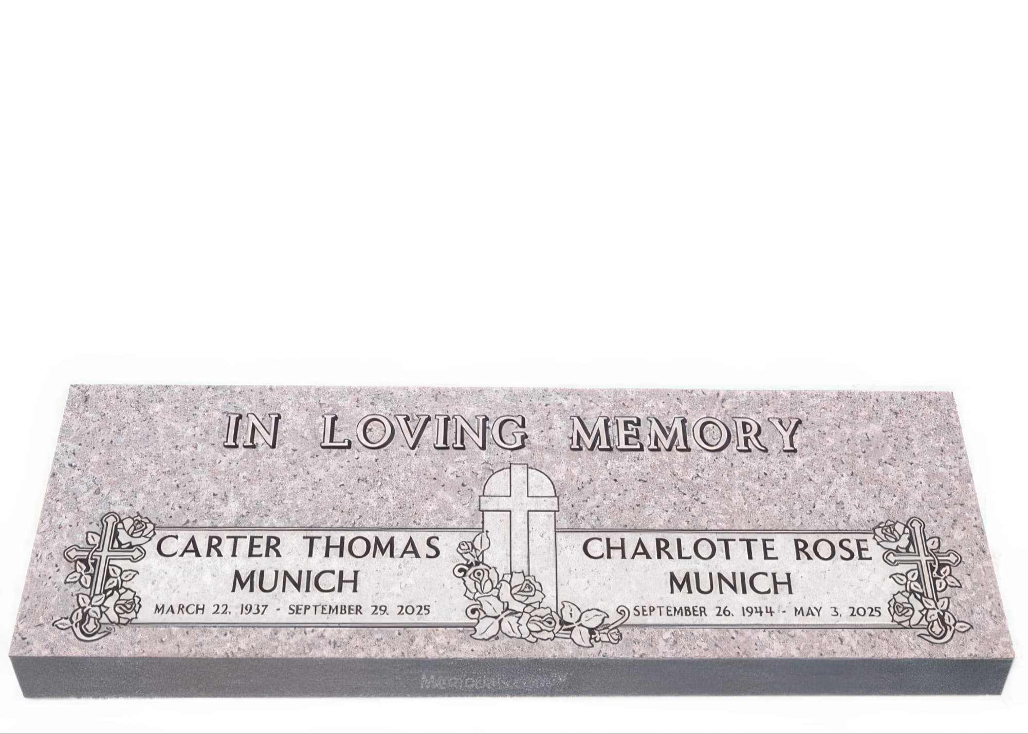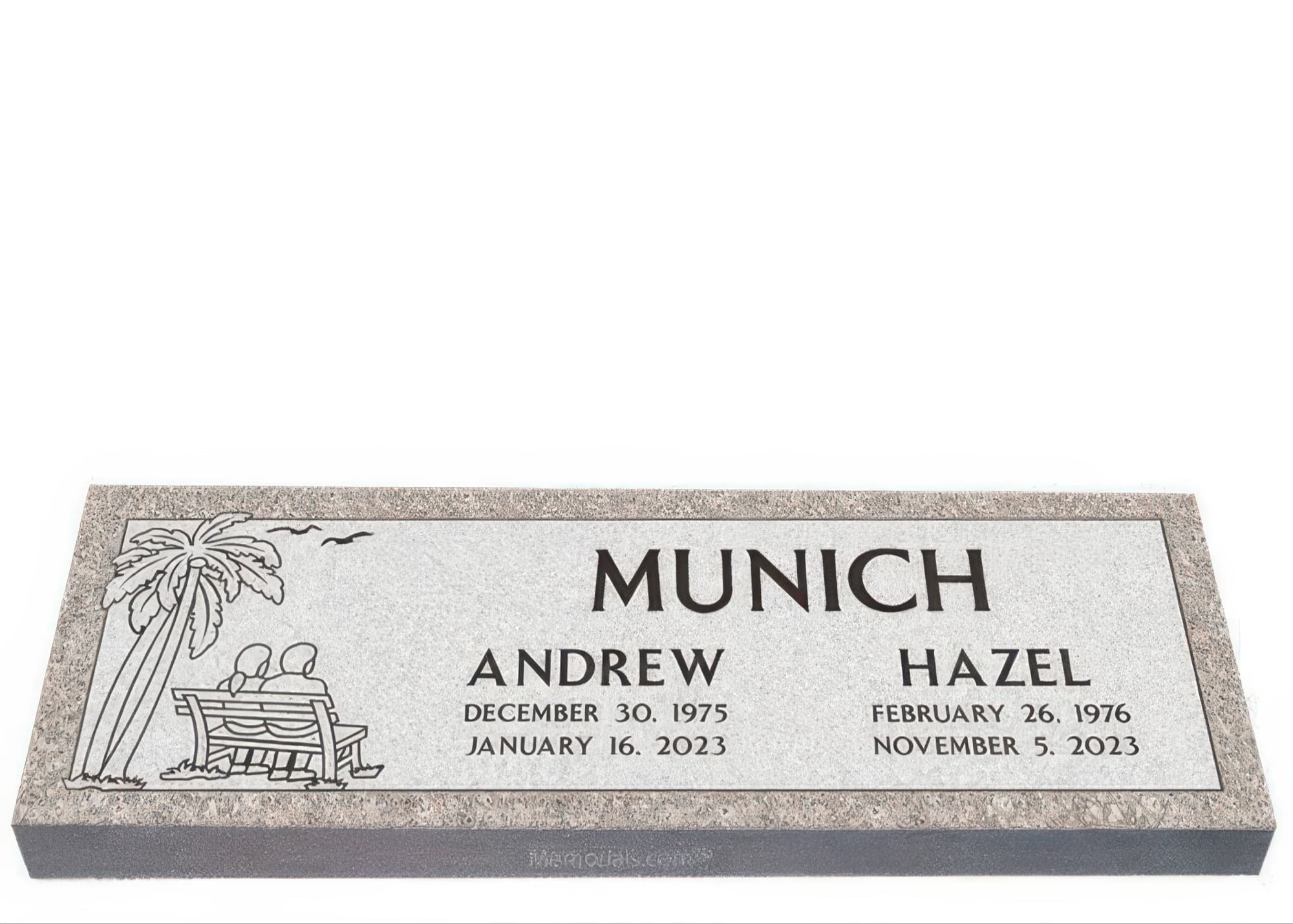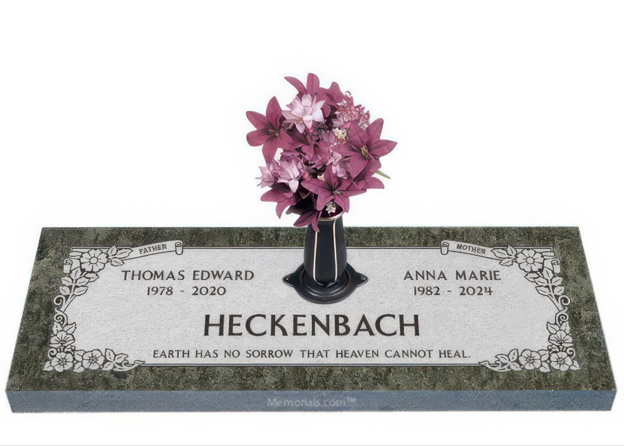 Memorials.com offers a wide selection of double headstones for husband and wife, crafted in natural granite and shipped directly to your cemetery. Our companion headstones for married couples feature custom engravings, emblems, and a choice of eight granite colors. Whether you need flat grave markers for couples or unique husband and wife headstones with themed designs like deer, celtic crosses, or tree of life motifs, we verify every order with your cemetery before production begins. Free shipping on all orders.