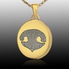 The Small Oval Nose Tag Print Cremation Keepsake is made of the finest 14k yellow gold. This beautiful keepsake features a nose print. The pendant can be further personalized on the back with engraved text. The small compartment within the pendant can hold a small amount of remains or any similar memento, such as crushed flower petals or earth from a special place. The high detailing and the fine precious metal will ensure that this pendant will become a treasured family heirloom for generations to come.
