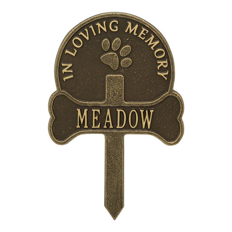 The Paw And Bone Customized Dedication Plaque is made of aluminum to create a wonderful tribute for a beloved pet. This plaque features a simple shape and traditional border, and is made to be displayed upright. It can be used as a grave marker, or simply to mark a pet's favorite place in the yard. The color options allow the plaque to either blend in or contrast the area it is set in. Create a dignified remembrance of a truly special companion animal with this beautiful memorial.