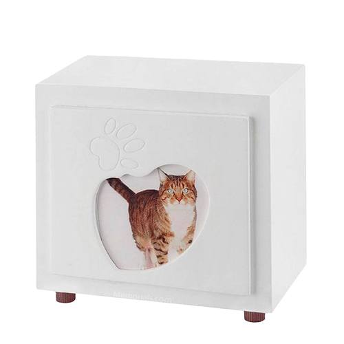 The Angel Paw Small Photo Pet Cremation Urn is made in Italy by highly skilled artisans. This gorgeous cremation urn made of wood and features a rich color. The face of the urn is impressed with a whimsical design of a loving cat and features a frame to display your favorite photograph. The bright color combined with the simple design will offer a modern and heartwarming remembrance of an unforgettable feline friend.
