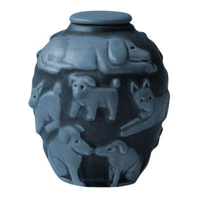 The Happy Dog Cremation urn is made by a talented artist of clay with an exquisite Blue Fog finish. This whimsical vessel depicts the many faces and moods of our K-9 companions. Create a beautiful tribute to your loyal friend with this beautiful cremation urn.