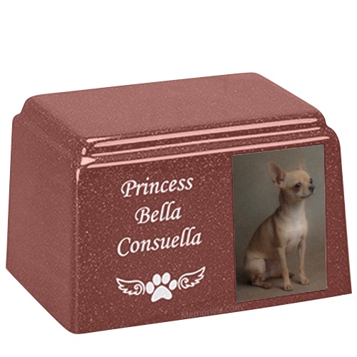 The Morning Rose Rectangle Cultured Pet Photo Urn is made from cultured marble material. It is an exquisite urn and even used as urn vault, perfect for home display or burial. A great urn for your loved one.